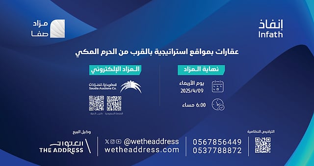 أعلنت "العنوان العقارية" عن إقامة مزاد "صفا" الإلكتروني، تحت إشراف مركز الإسناد والتصفية "إنفاذ"، عبر "المنصة السعودية للمزادات"، يوم الإثنين 7 أبريل 2025م عند تمام الساعة 11.00 صباحًا، ويُختتم يوم الأربعاء 9 أبريل بين الساعة 4:30م لغاية 6:00 مساءً.